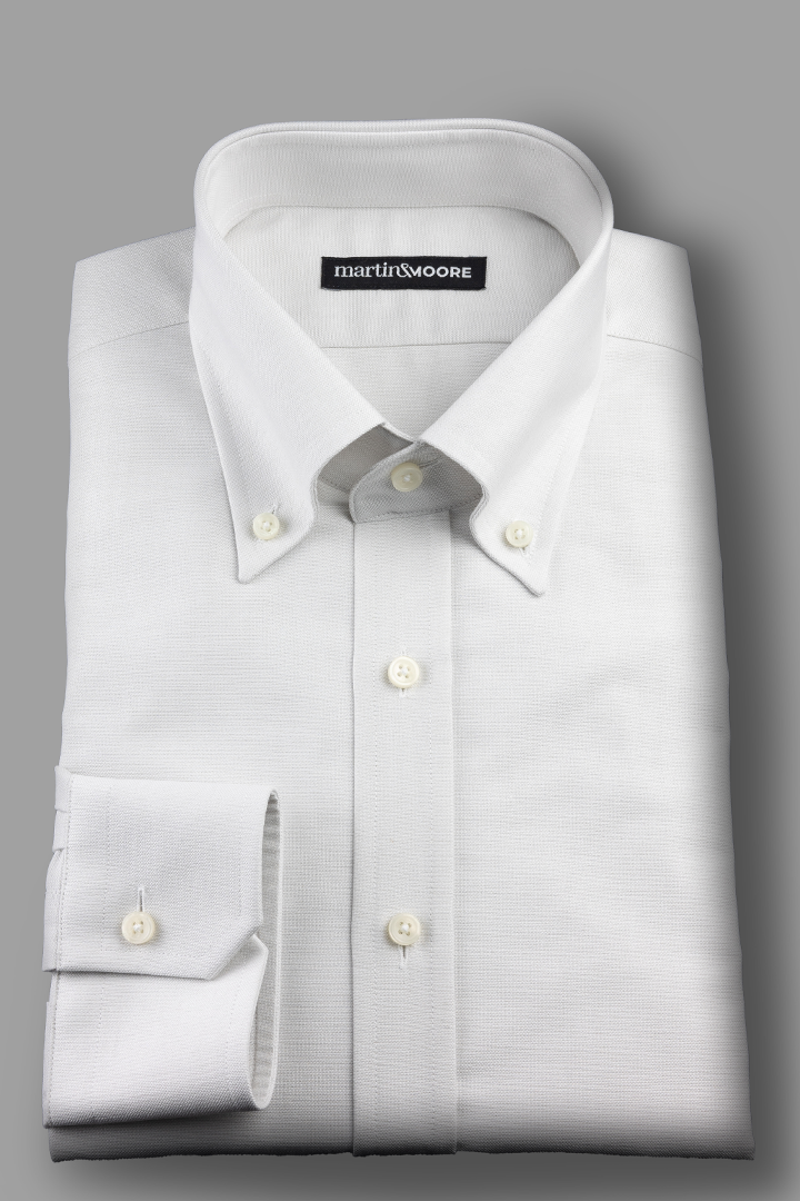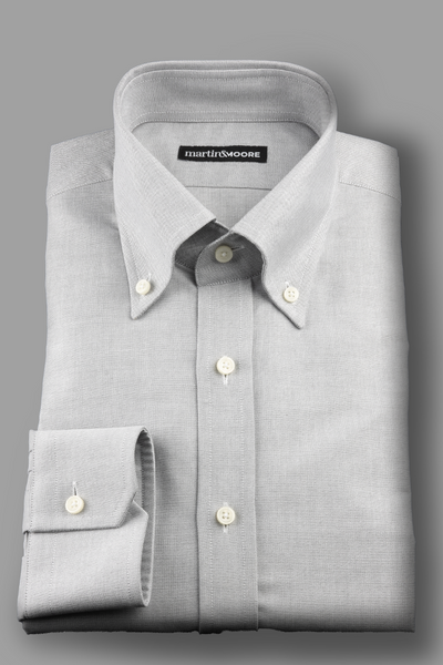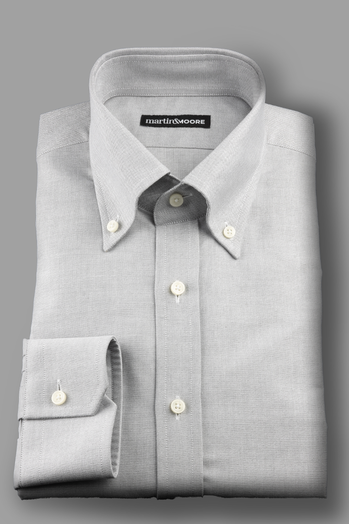 ( ilość produktów: 18 )Męska bawełniana koszula OCBD z japońskiego Oxfordu w jasnoszarym odcieniu – duży kołnierz, odszywana plisa i ścięte mankiety
