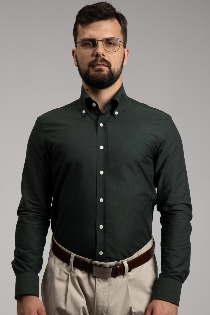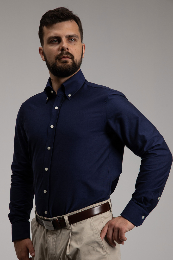 Męska bawełniana koszula OCBD w odcieniu lekko fiołkowym – duży kołnierz, odszywana plisa i ścięte mankiety
